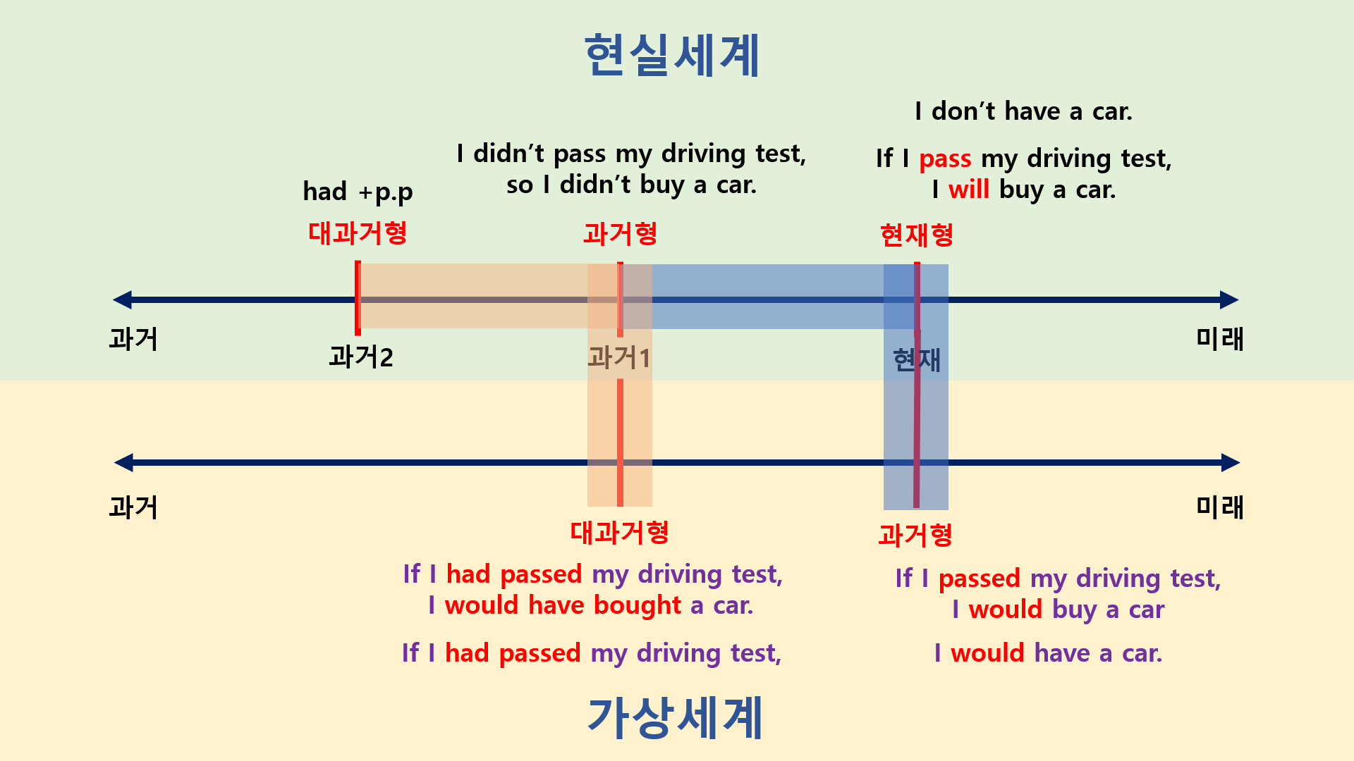 문장 (1)은 ‘나 면허 시험 통과하면 차 살 거야.’이런 뜻이죠. 현재형이니까 현재에 대한 가정이고, 이건 현실세계에 관한 거예요. 그러니까 이 표현은 실제 면허시험 보고 난 다음에 시험에 통과하면 정말 차를 살 거란 의지를 보이는 말이에요. 문장 (2) 역시 현재를 가정하는 표현이지만 과거형으로 쓰여서 이건 현실세계와 상관없는 가상세계에 관한 거예요. 왜 우리도 이런 표현하잖아요? 내가 면허시험 통과했으면 나는 차 샀겠다.’ 이런 말은 내가 정말 면허시험 본 후에 결과를 기다리며, 실제로 차를 사겠다는 의지를 표현하려고 하지는 않아요. 어디까지나 가상의 상황을 얘기하는 표현이죠. 문장 (1)과 (2)의 의미 차이 이제 확실히 아시겠나요? 문장(3)은 실제 과거사건에 대해 상상으로 가정해 본 거예요: 내가 면허 시험을 통과했었 더라면 차를 샀었을 텐데. 그러니까 실제 과거에서는 시험에 통과하지 않았고, 차를 사지도 았았던 거죠. 마지막 문장 (4)도 내가 시험에 통과하지 못했을 때 하는 가정이에요: 그때 면허시험 통과했었으면 (그때 차를 사서) 지금 차가 있었을 텐데.