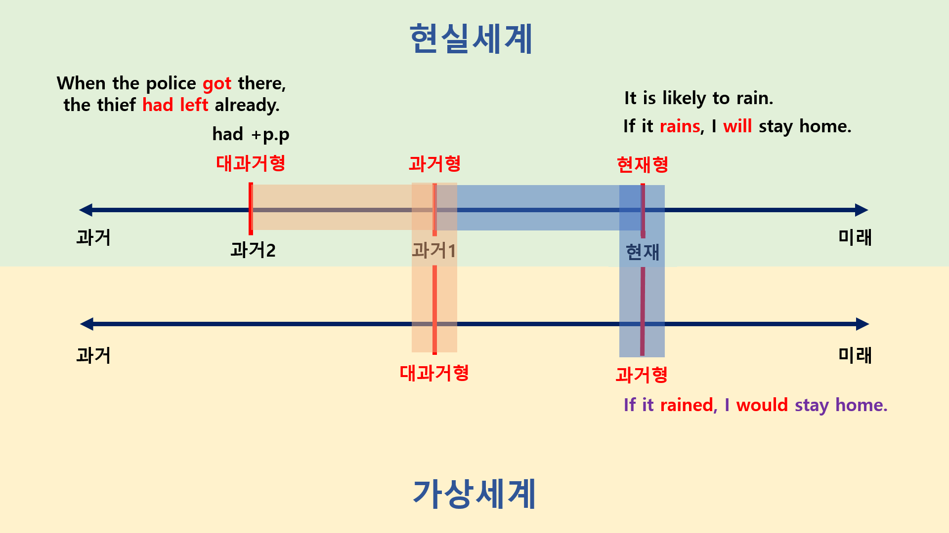 그런데 우리가 어떤 일을 가정할 때는 현재 상황뿐 아니라 ‘예전에 이렇게 했으면 이랬을 텐데’ 하고 과거에 대해서도 가정을 해보잖아요. 그럼 실제 (현실)의 과거와 과거에 대한 상상 차이는 어떻게 표현할까요? 현재에 대한 상상과는 과거에 대한 상상은 당연히 달라야 하잖아요? 그래서 과거에 대한 상상은 대과거형을 써서 표현해요. 대과거는 과거 한 시점보다 더 오랜 된 과거를 표현하는 방법이고 조동사 had와 과거분사 pp를 사용합니다. 대과거에 대해 잘 모르시는 분들을 위해 예를 하나 들어 볼게요.