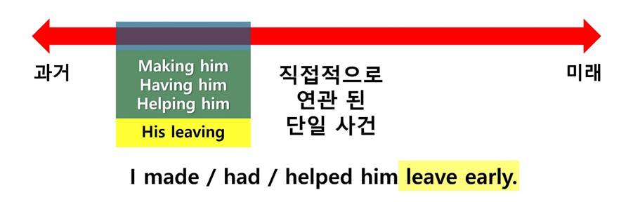 그림1은 (13)을 나타내고 있어요. 설득하고 명령하고 허락한 사건이 일어나고, 그가 일찍 떠나는 건 그 이후, 미래에 일어날 수 있는 일이 되는 거죠. 사실 엄격히 말한다면 그가 실제 일찍 떠났는지는 여부는 문장(13)에 명시돼 있지는 않아요. 그래서 설득, 명령, 허락과 그가 일찍 떠나는 일은 간접적으로 연관된 두 가지 사건이에요. 반면에 그림2는 문장 (14)를 나타내요. 나의 행동은 그가 떠난 행동의 시간대와 겹쳐져 일어난 일이 되는 거죠. 그래서 이 문장은 그가 실제 일찍 떠났다는 걸 나타내고요. 왜냐면 “I made him leave early.”는 그가 원하든 않든 내가 등 떠밀어 일찍 보낸 거고, “I had him leave early.”는 내가 직접 그의 일정을 조율하는 등 적극적인 행위를 통해 그가 일찍 떠난 거고, “I helped him leave early.”는 나의 적극적인 도움행위로 그가 일찍 떠난 거에요. 다시 말해, 문장 (13)과 달리 문장(14)에서는 나의 행동과 그가 일찍 떠난 건 직접적으로 연관된 단일 사건인 거죠. 이렇게 본동사와 보어로 나온 동사가 같은 시간대에 행해질 때 to부정사 대신 동사원형이 나옵니다.